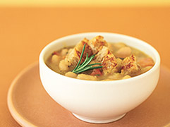 Ladle the stew into warmed bowls and sprinkle with the croutons. Garnish each bowl with a rosemary sprig and serve immediately.